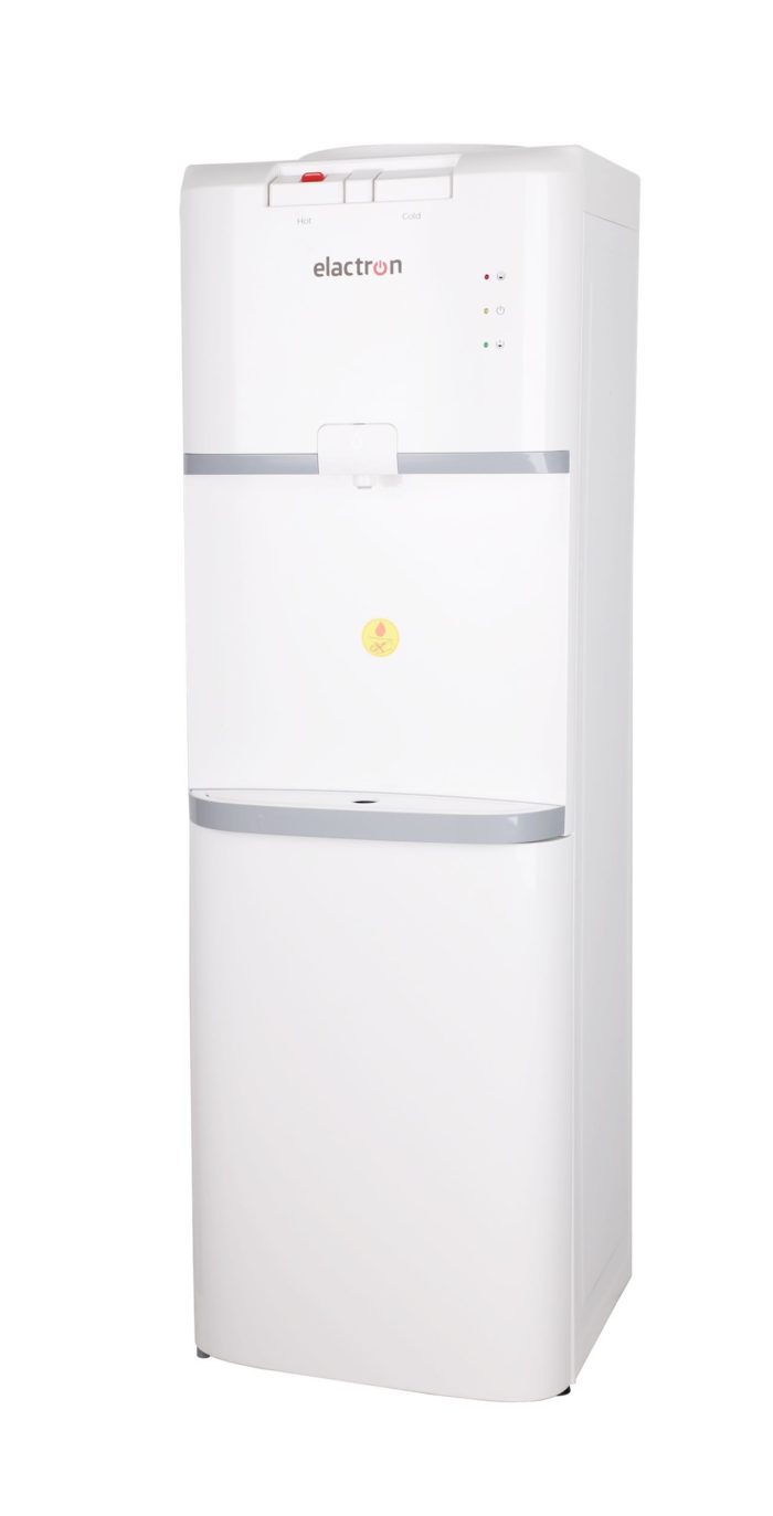 La fontaine Elactron FN-666E est un appareil vertical au design sobre et moderne, généralement en finition blanc cassé ou noir selon les modèles. Elle dispose de trois robinets alignés à l’avant permettant de distribuer de l’eau à différentes températures : froide, chaude et température ambiante. Sous les robinets se trouve un compartiment fermé, appelé cabine de rangement, pratique pour stocker des gobelets, sachets de thé ou petits accessoires.